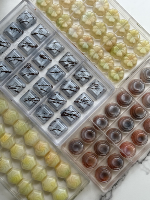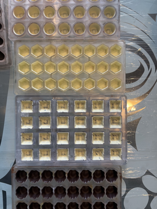 着色を終えた次の工程は、型にテンパリングしたチョコレートを流し込んで、シェル(殻)をつくる工程。 で、その次にガナッシュをいれて、蓋締めをして完成… っていう流れになる。