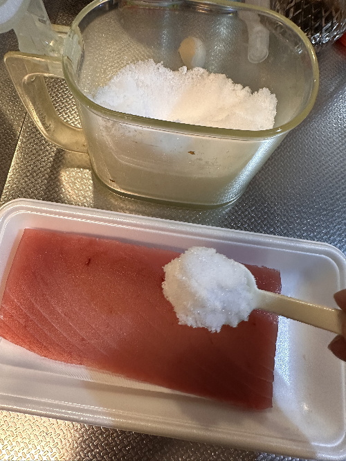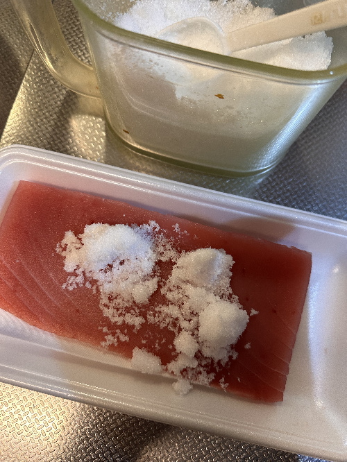 まず、〝柵〟の状態で、全面にまんべんなく塩をまぶして、10分ほど放置します。 その後、塩を水洗いして落として、ペーパーなどで水けをふきとります。 で、後は好みの厚さに切って、盛り付ける。 ただし、放置しすぎると塩味がきつくなってしまうので要注意で!